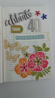 En esta página utilicé un stencil de mariposas, con tinta distress Mowed Lawn, sellos de Lawn Fawn para el sentimiento, y de Aladine y Lorabailora para el número y el mes respectivamente.
